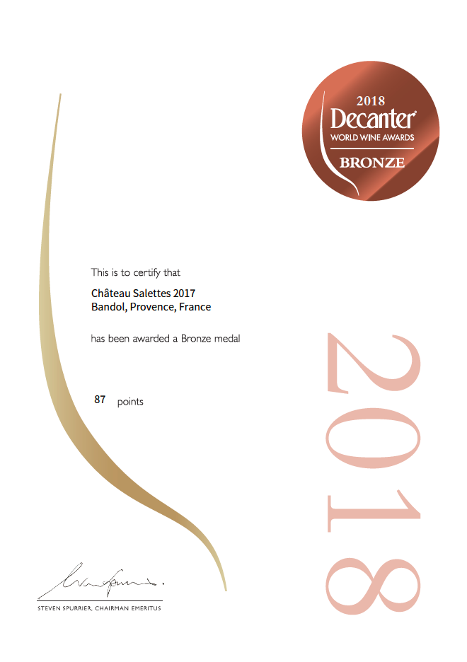 Château Salettes rosé 2017 – Médaille de bronze Par bikloz | 5 juin 2018 Le millésime 2017 du Château Salettes rosé, bandol, a obtenu la médaille d’argent (87 points) par la sélection DECANTER 2018. Publié dans A la une, Actualités, Prix et distinctions