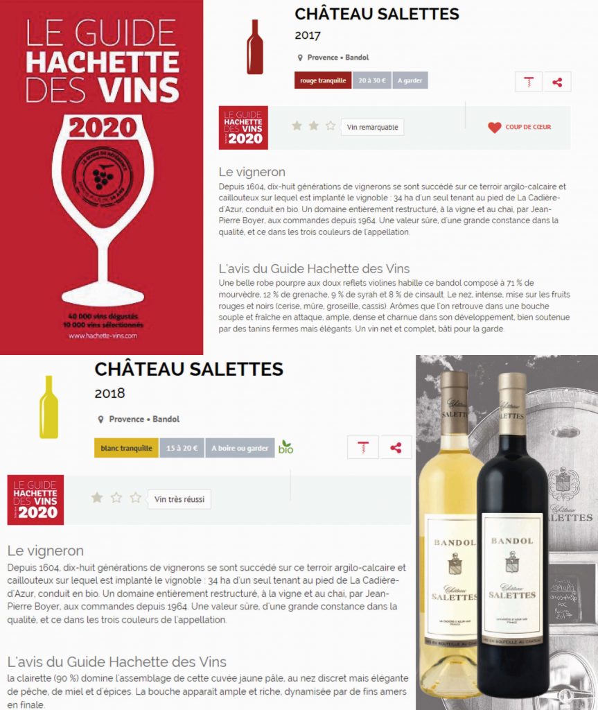 Le Château Salettes rouge 2017 a été élu « coup de coeur » du guide Hachette 2020. Le Château Salettes Blanc 2018 à quant à lui été qualifié de vin « très réussi ».